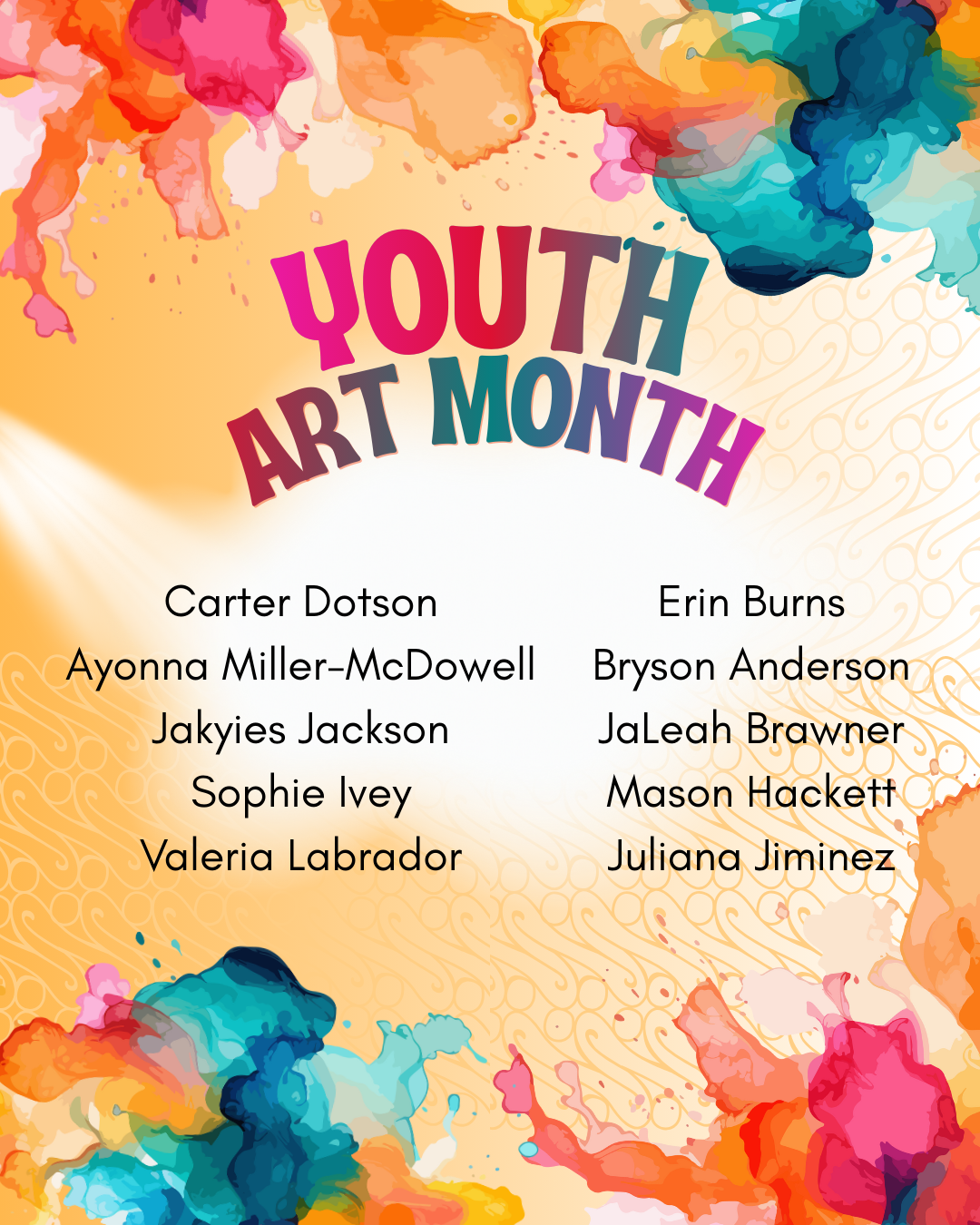 The Youth Art Month Awards Ceremony will be held on Thursday, March 5, from 5:15–6:00 PM at the Anderson Arts Center.